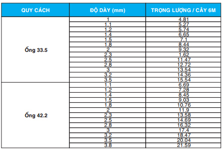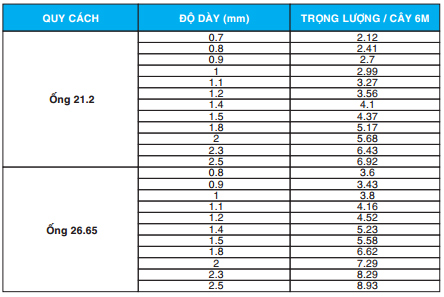 Tương ứng với mỗi kích thước lại được chia nhỏ thành những kích thước tương ứng với khối lượng được tính theo kg/m.
