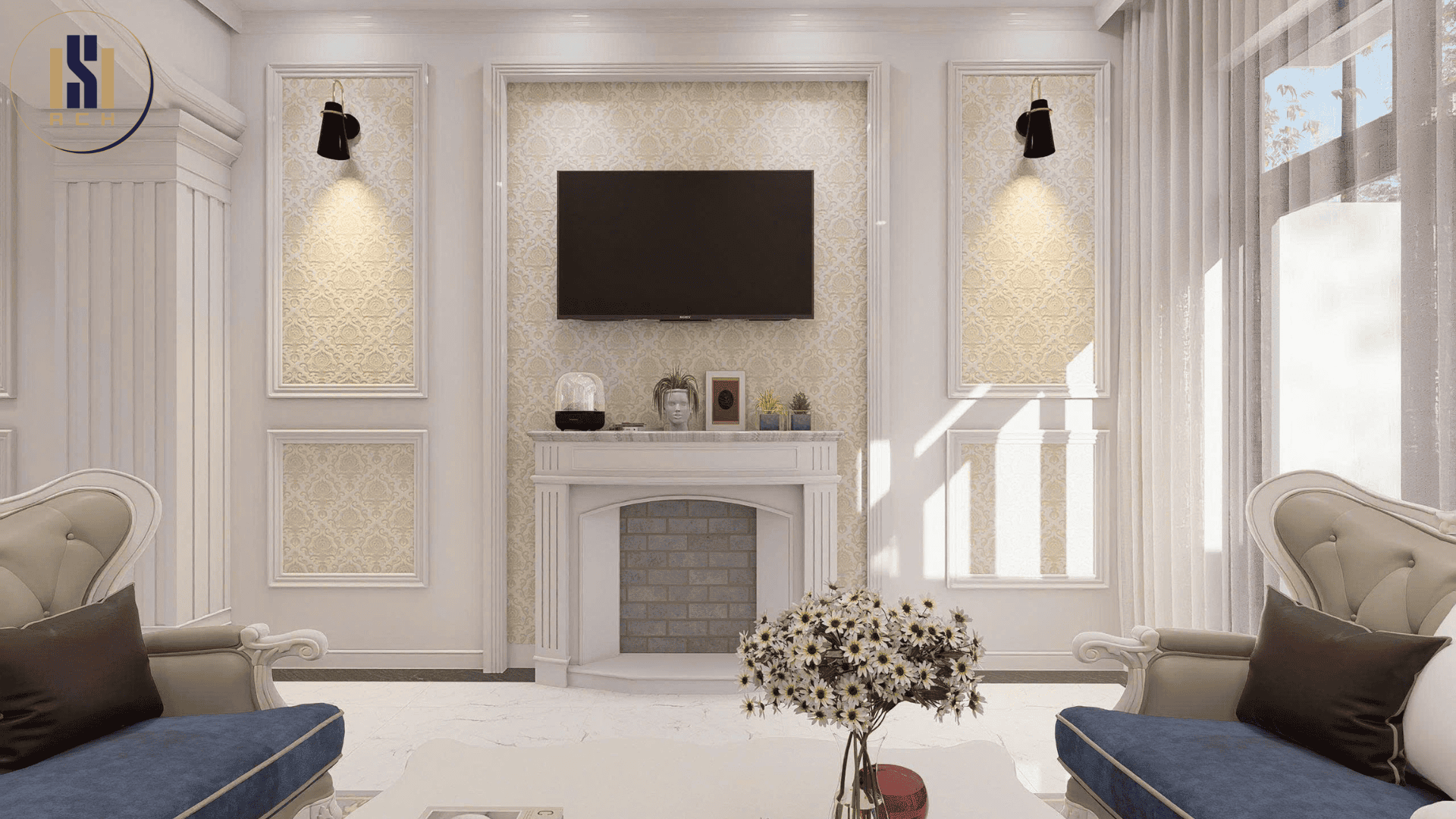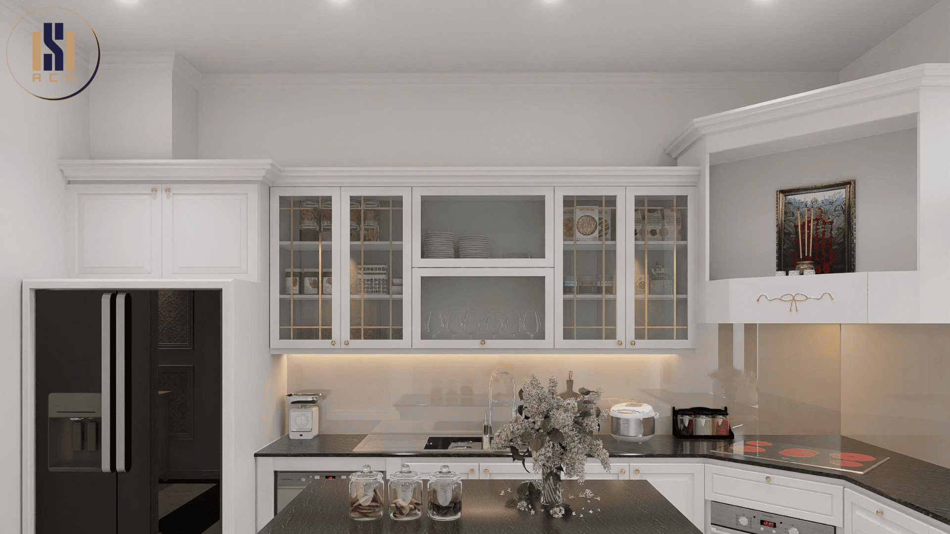 Khu vực nhà bếp bày trí đơn giản, lấy tông màu trắng làm chủ đạo rất sang trọng. Điểm nhấn ở đây chính là dùng gạch ốp tường có họa tiết hoa văn độc đáo. Hệ thống tủ bếp âm tường tiết kiệm không gian nhà bếp đáng kể.